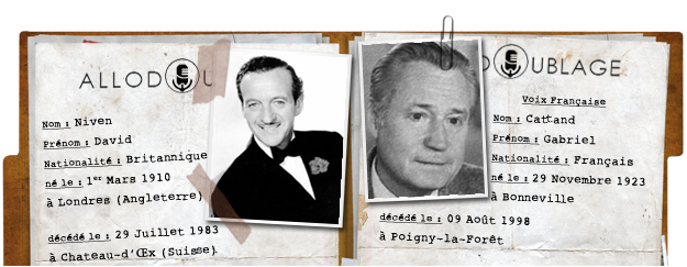 C'est le comédien Gabriel Cattand qui prêtera sa voix à David Niven dans ce film.